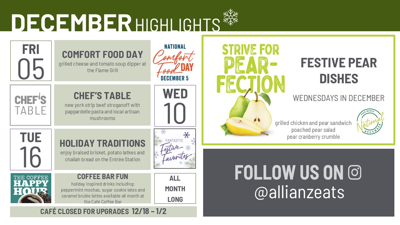 December is National Pear Month! Join us in the Bistro on Tuesday December 16 for herb grilled chicken with pears, blue cheese, lettuce and red onion on toasted telera at the Flame Grill. Every Wednesday in December at the Cafe find an amazing pear dish!